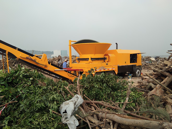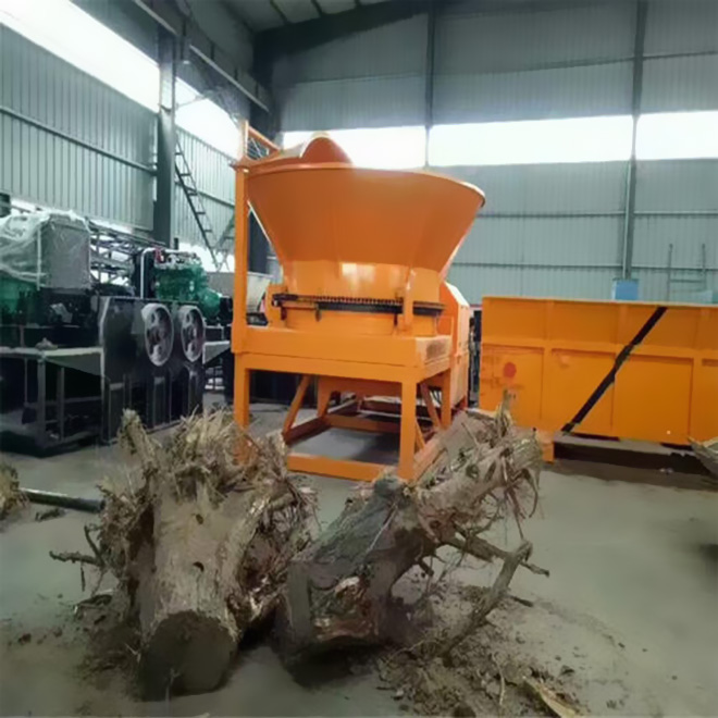 樹(shù)根粉碎機(jī)工作時(shí),由電機(jī)帶動(dòng)轉(zhuǎn)子進(jìn)行高速旋轉(zhuǎn),同時(shí)進(jìn)料斗也在電機(jī)的帶動(dòng)下進(jìn)行緩慢的旋轉(zhuǎn),物料經(jīng)抓機(jī)投放進(jìn)料斗,料斗在旋轉(zhuǎn)的同時(shí)內(nèi)壁上的撥料齒會(huì)將物料均勻的撥到轉(zhuǎn)子上,高速旋轉(zhuǎn)的轉(zhuǎn)子碰到物料經(jīng)由轉(zhuǎn)子上刀片的切削和撕扯實(shí)現(xiàn)物料的初步破碎,進(jìn)過(guò)初步破碎的物料無(wú)在自身重力和轉(zhuǎn)子沖擊力的作用下掉在破碎腔內(nèi)的篩網(wǎng)上,符合要求的物料會(huì)通過(guò)篩網(wǎng)排出,而不符合要求的會(huì)在破碎腔內(nèi)進(jìn)行二次甚至三次的破碎加工直至符合要求。