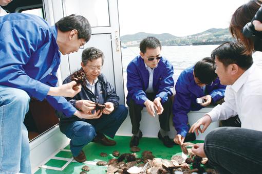 唐啟升院士(左二)與科研人員在現(xiàn)場(chǎng)討論貝類育苗設(shè)施實(shí)驗(yàn)情況