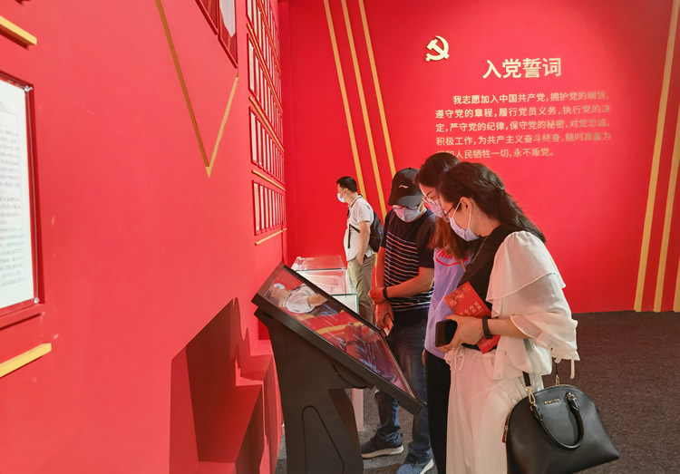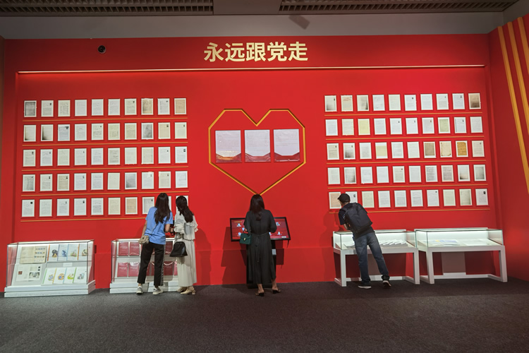 “永遠(yuǎn)跟黨走”一面紅墻最頂部寫著五個(gè)亮眼的大字,紅墻之上陳列滿了百位科學(xué)家的入黨申請(qǐng)書。泛黃的紙張上,科學(xué)家們工整優(yōu)美的字跡,真誠(chéng)質(zhì)樸的心聲,包含著他們?yōu)辄h為國(guó)的一片赤誠(chéng)。