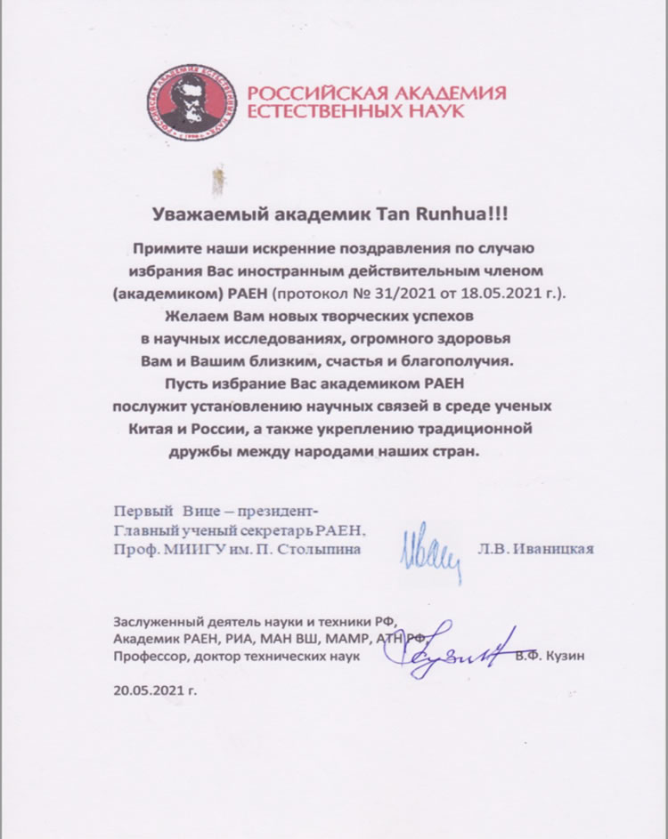 請(qǐng)接受我們真誠(chéng)的祝賀,您被選舉為俄羅斯自然科學(xué)院外國(guó)有效成員(院士),2021年5月18日,№ 31/2021決議。