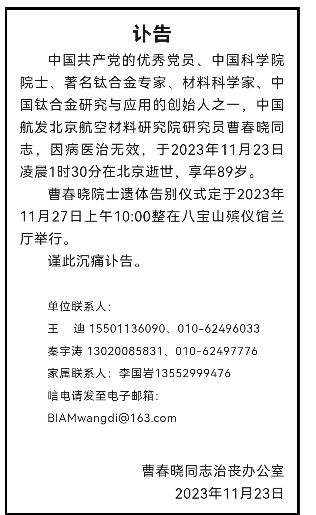 本刊編委會(huì)副主任、中國(guó)科學(xué)院院士、著名鈦合金專(zhuān)家、材料科學(xué)家、中國(guó)航發(fā)北京航空材料研究院研究員曹春曉同志,因病醫(yī)治無(wú)效,于2023年11月23日凌晨1時(shí)30分在北京逝世,享年89歲。