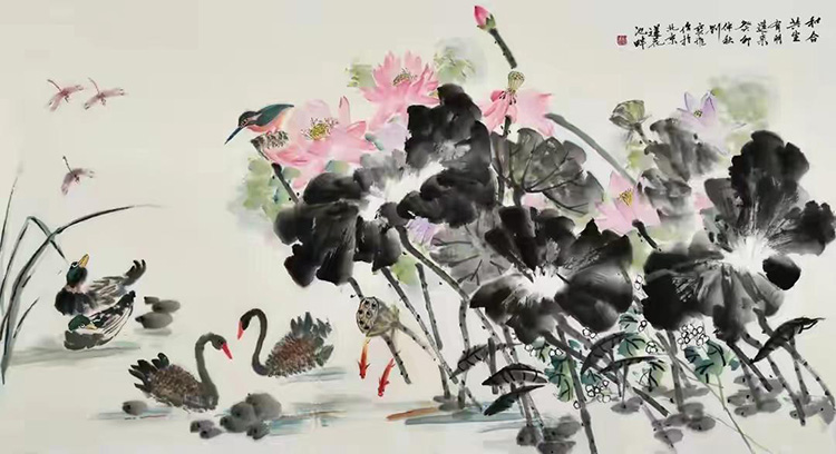 劉寶堆荷花美術(shù)作品《和合共生 有朋遠(yuǎn)來》95x180