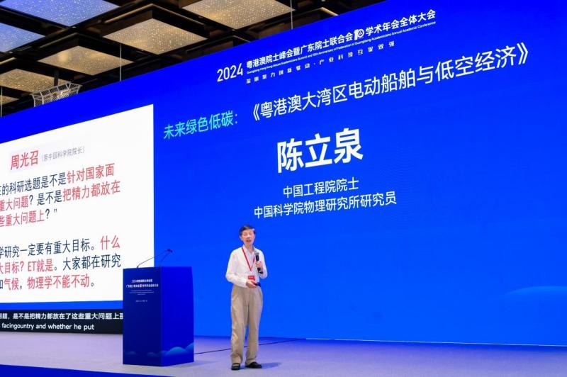 中國工程院院士、中國科學(xué)院物理研究所研究員陳立泉帶來《粵港澳大灣區(qū)電動船舶與低空經(jīng)濟》專題報告。