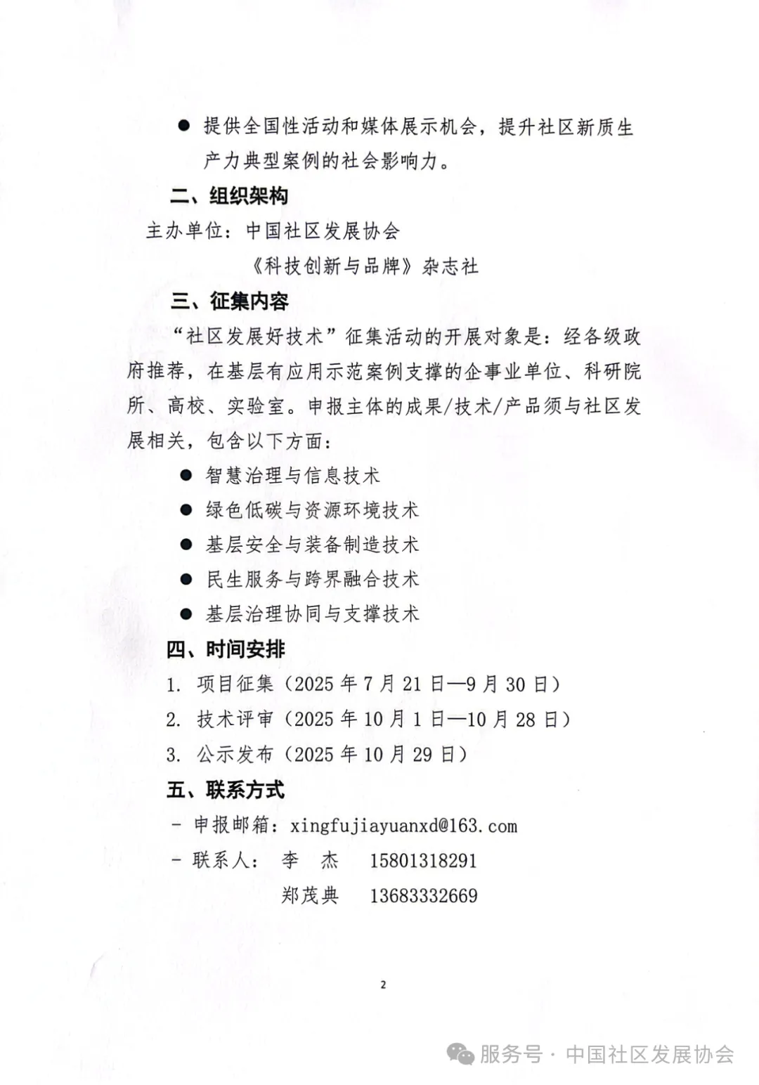 為深入貫徹落實黨的二十大精神,推動城鄉(xiāng)社區(qū)治理體系和治理能力現(xiàn)代化,借助“幸福家園行動”,充分發(fā)揮科技創(chuàng)新在社區(qū)高質(zhì)量發(fā)展中的引領(lǐng)作用,中國社區(qū)發(fā)展協(xié)會聯(lián)合《科技創(chuàng)新與品牌》雜志社,面向全國各地政府部門、企事業(yè)單位(含高??蒲性核?等,公開征集其在社區(qū)治理智慧服務(wù)、綠色低碳等領(lǐng)域的先進技術(shù)與創(chuàng)新模式,助力社區(qū)新質(zhì)生產(chǎn)力快速發(fā)展?,F(xiàn)將有關(guān)事項通知如下: